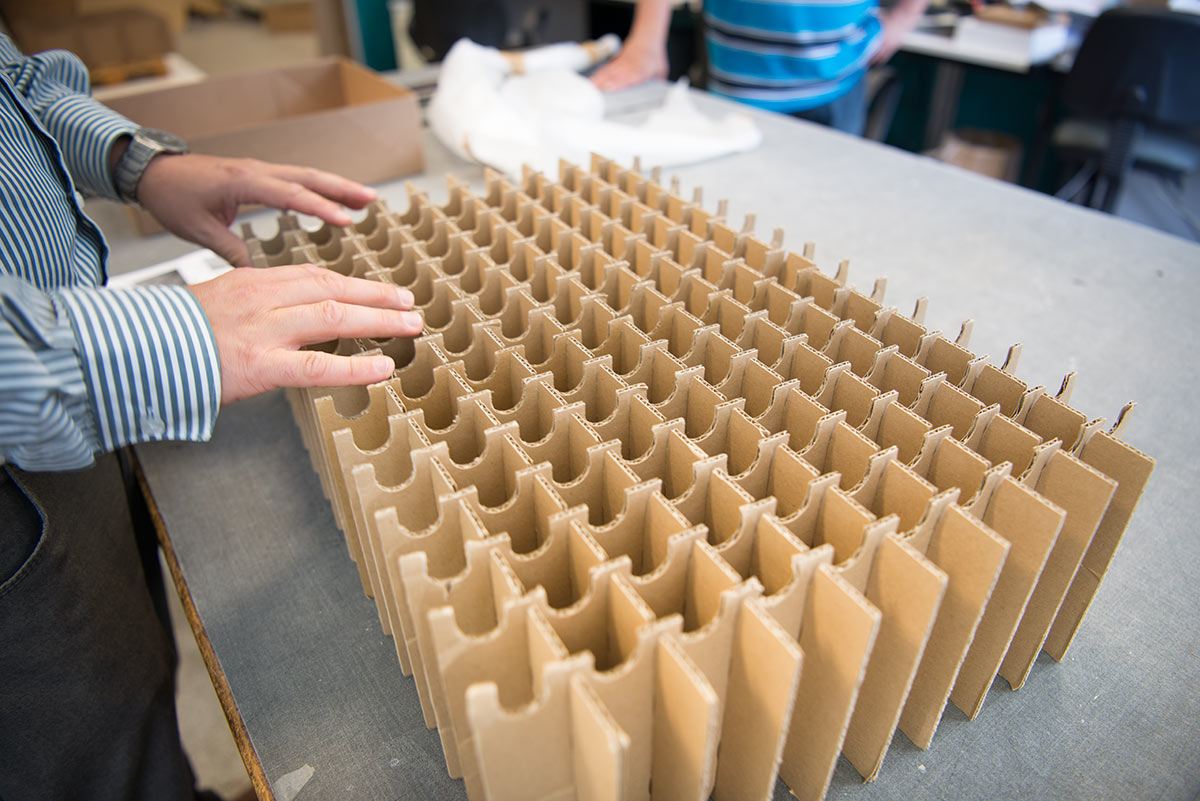 Fächereinsätze aus und für Kartonagen können von uns maschinell fertiggesteckt und auch in großen Mengen schnell und platzsparend an Sie ausgeliefert werden.